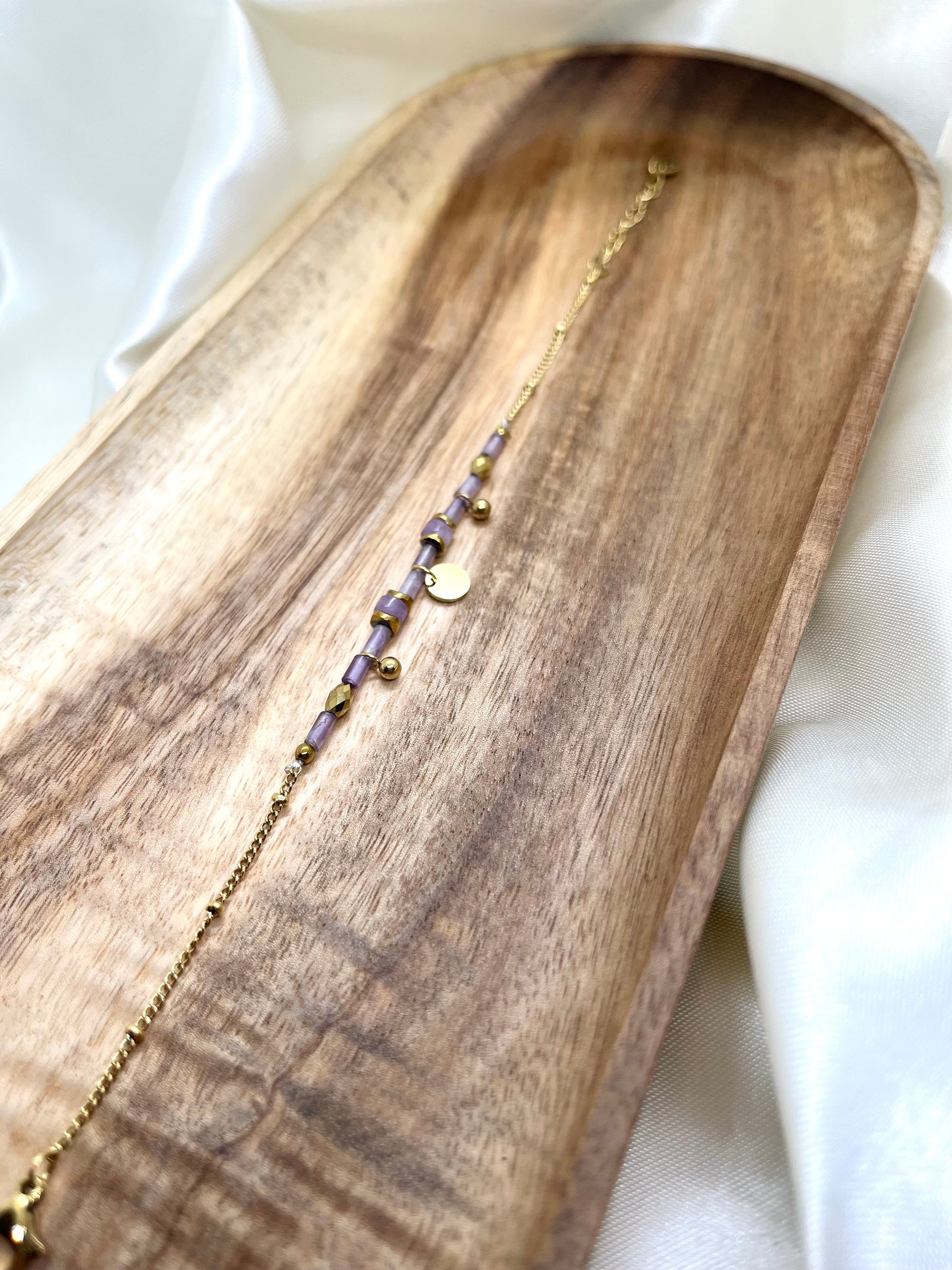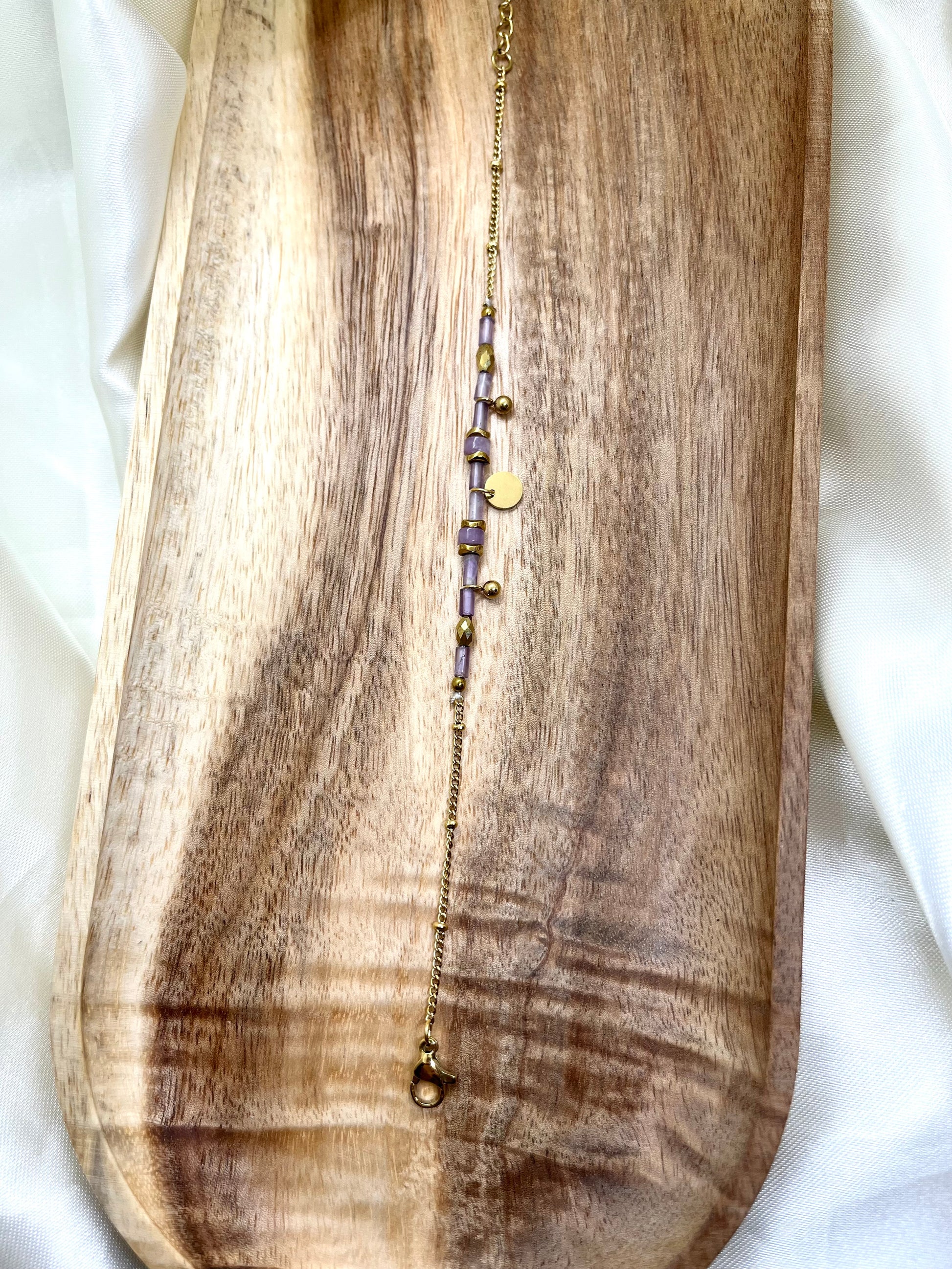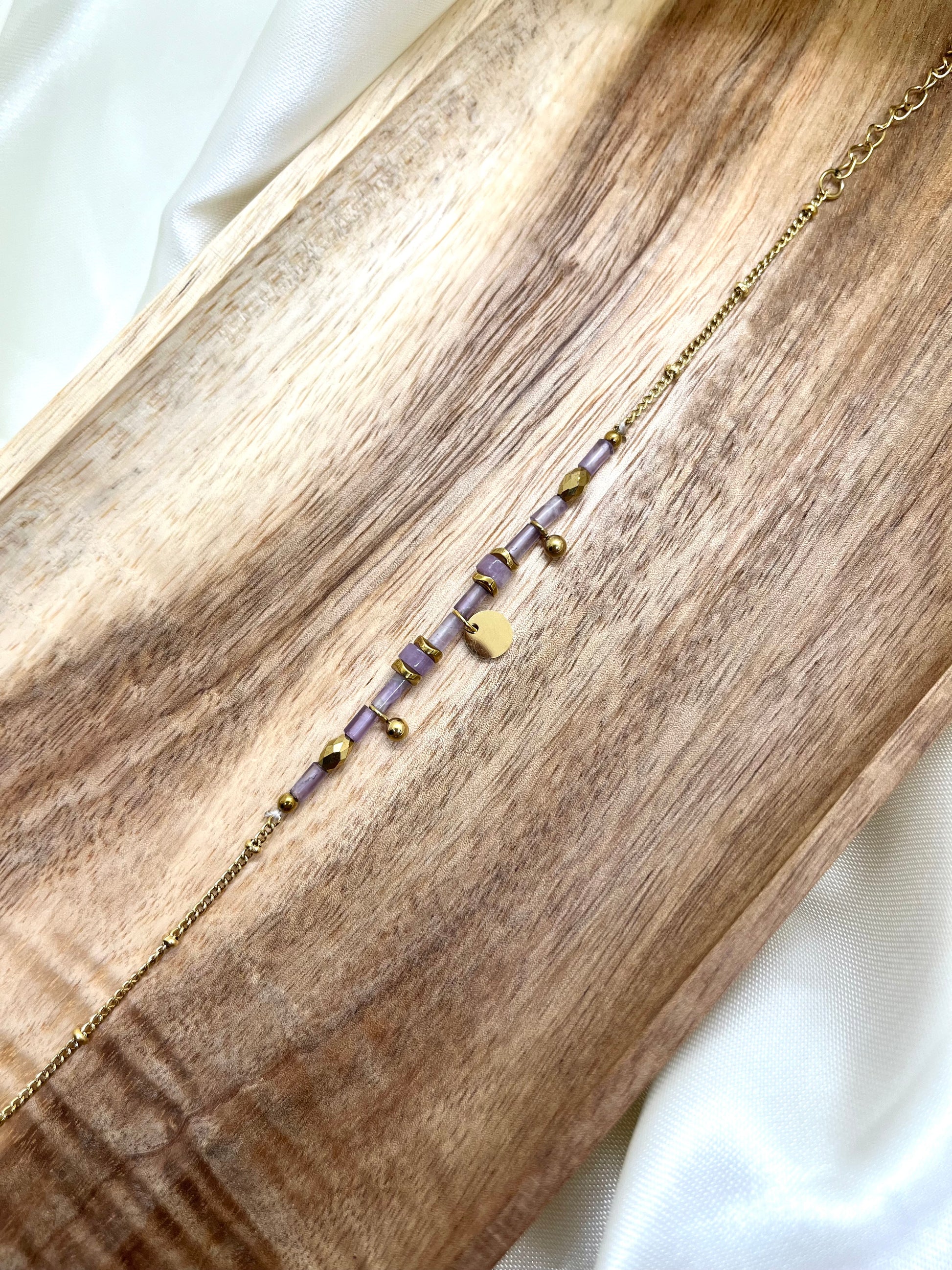 Bracelet doré et perles violettes